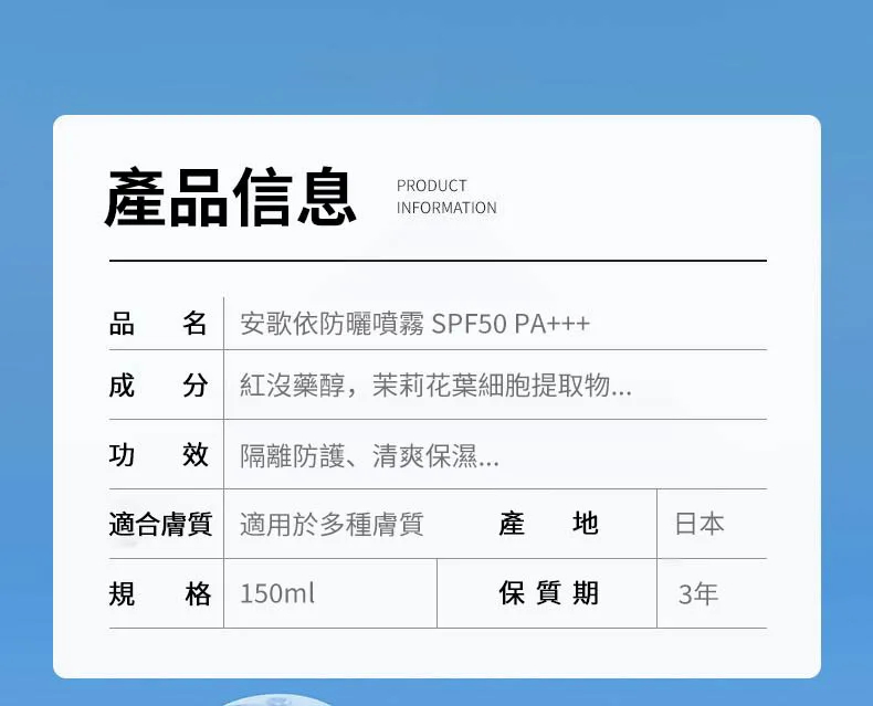 12分鐘前安歌依光圈防曬噴霧,細密噴頭設計 噴頭360°可旋轉自然膚惑,隔離防曬一瓶搞定 - 僅此一天「安歌依光圈防曬噴霧」8入72%用戶的選擇!NT$1598【限時免運】